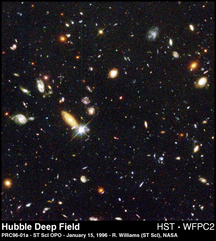 The galaxies in this image are known lie over a wide range of distances. Some of the galaxies are at the largest distances ever measured (over 10 billion light years). This means that we are seeing them at a time when the Universe was very young. Imagine that you are interested in determining if there were galaxies at those great distances (early times) similar to the ones we see nearby (today). Assume you know the distances to many of the galaxies (we'll figure out how, in the next Lab), but now you have to figure out a way to compare 'apples to apples.' How would you do it? Would some form of classification be useful?