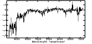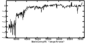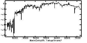 The spectra are plotted as log(flux) versus wavelength (in Angstroms). The log scale on the y-axis allows you to see the often large changes in flux from wavelength to wavelength. The flux scale (y-axis) has been arbitrarily set to 1 (log(flux) = 0) at 5500 Angstroms.