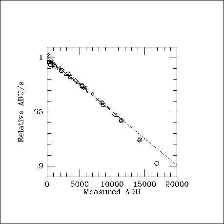 Consider that you are given a set of dome flats which consist of exposures of different length of the same, diffuse, illuminating source. You plot the mean counts per pixel per second vs. the mean counts per pixel for the total exposure. The plot (figure 1) shows a systematic decrease in the counts/pix/sec as the total counts/pix increases. In other words, the detector has a non-linear response. Normalizing the counts/pix/s (y) to unity at counts/pix (x) = 0, the relation is well described to half-well as