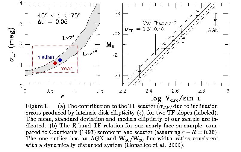 (c) The Scatter Budget in the Tully-Fisher Relation: Based on our measurement of the intrinsic ellipticity of spiral disks, we have determined that this ellipticity conributes up to 50% of the total scatter observed in this line-width--luminosity relation. As such, this indicates that there is only 0.1-0.2 mag left for all other sources of astrophysical scatter in the Tully-Fisher Relation. This places severe limits, for example, on the stellar and total M/L in these disk systems.
