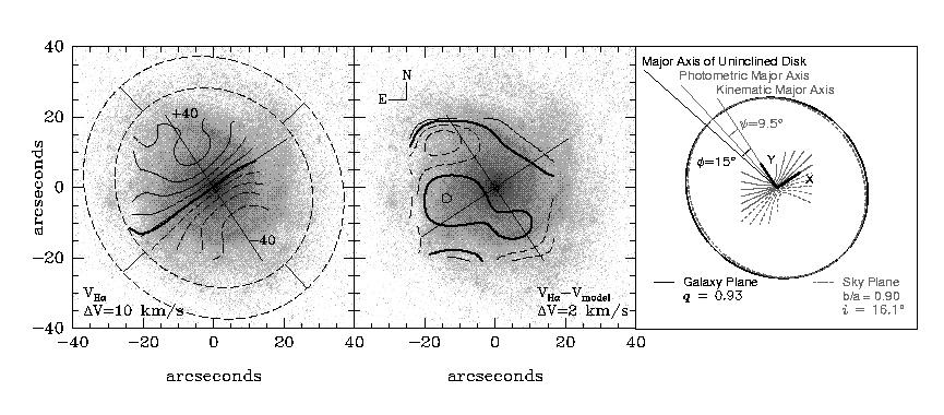 In the left panel is the H-alpha velocity field (contours) for UGC 4380, overlayed on a grey-scale image taken in the R band. The major and minor kinematic axes are labeled, based on a simple fit to the observed velocity field. The photometric major and minor axes are labeled within the dashed annulus, and exhibit an offset from the kinematic values. The central panel shows the residuals between our simple model velocity field and the observed data simply to show that these residuals are very small. The right panel shows how the mis-matched position angles are used to derive an intrinsic inclination.