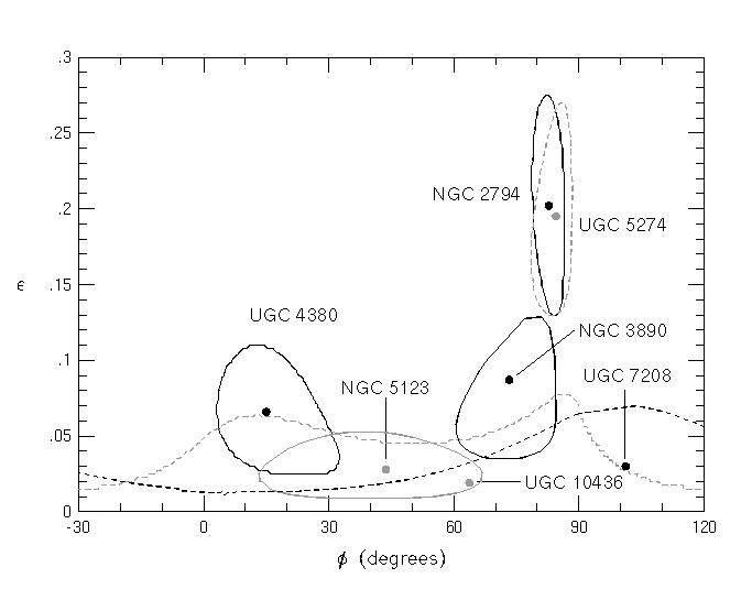 (c) The Shape of Galaxy Disks: By combinning photometric and kinematic maps of our nearly face-on systems, we are able to measure the intrincis ellipticity of the disks. This is done by comparing the mis-match between the kinematic and photometric position angles of the major axis, in combination with the observed apparent photometic ellipticity (photomeric axial ratio, b/a), and the true inclination as determined from the kinematics. The procedure is illustrated here: