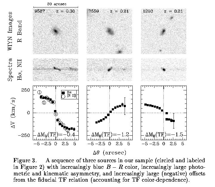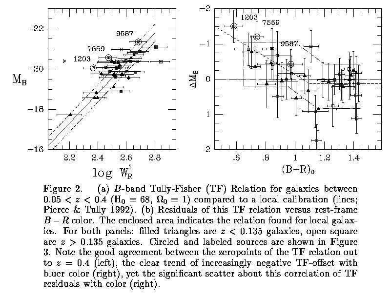 In the followin figure, residuals from the intermediate-redshift Tully-Fisher relation (z = 0.05 to 0.4) show an offset with color the completely accounts for the apparent trend with redshift (from Bershady and Andersen 2001). The three labeled sources are zdiscussed next.