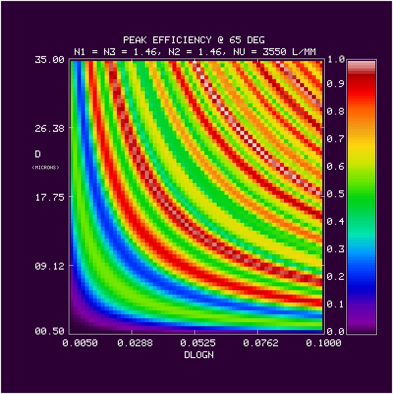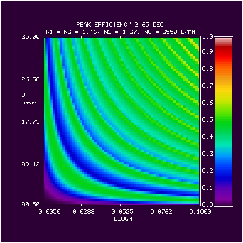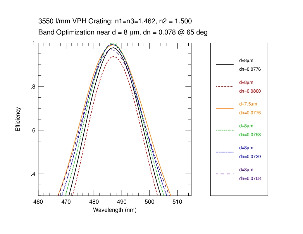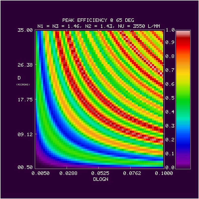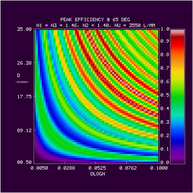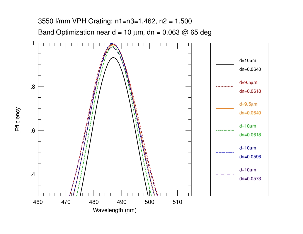 We calculate the efficiency within a bandpass between 380-680 nm at 1 nm resolution for a 3550 l/mm grating at an incidence angle of 65 deg in first order. The calculation is repeated over a grid in mean index (5 values of n2 = 1.37, 1.40, 1.43, 1.46, 1.50), DCG index modulation (64 values dlogn from 0.005 to 0.1), and DCG thickness (70 values of D from 0.5 to 35 microns). The last n2 value (1.50) was done later, and is the adopted CSL target value. At each grid point we have evaluated the the bandpass in terms of: