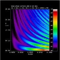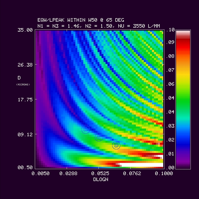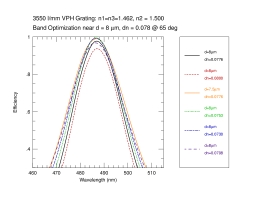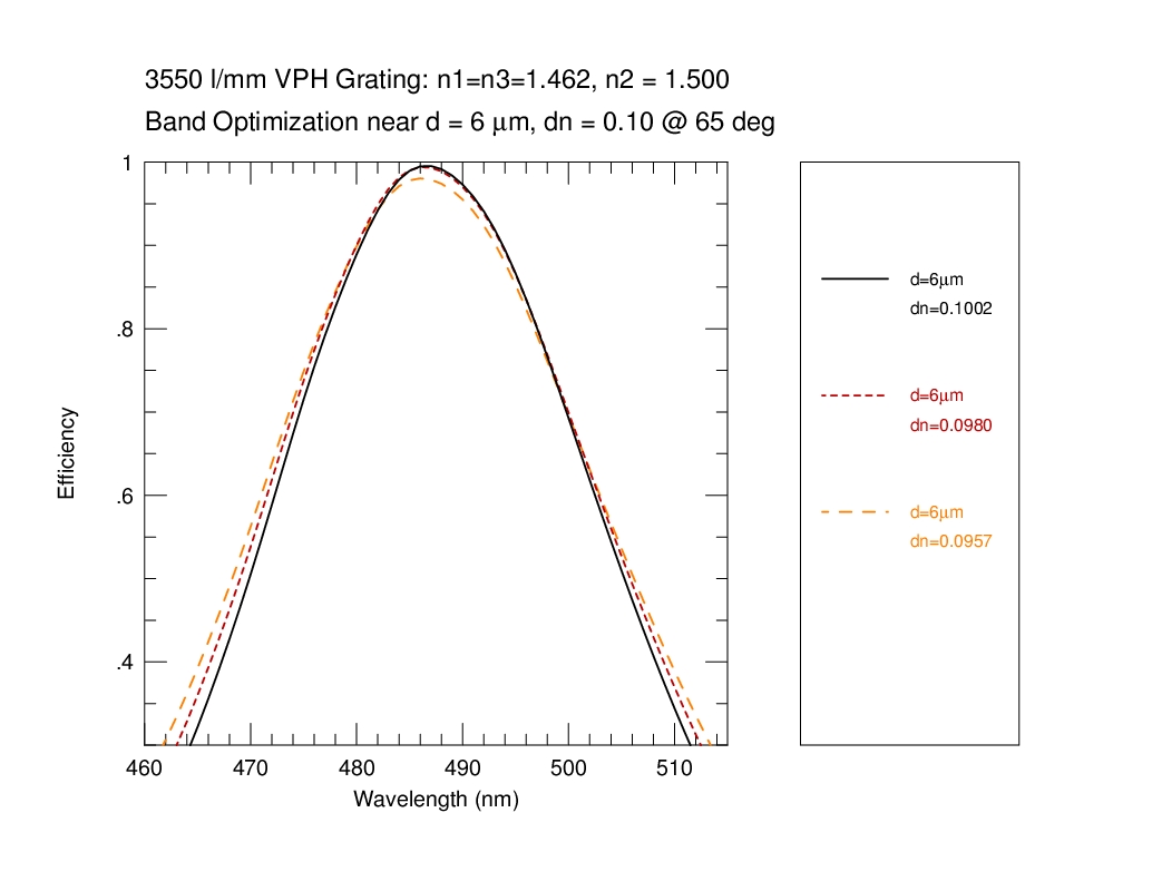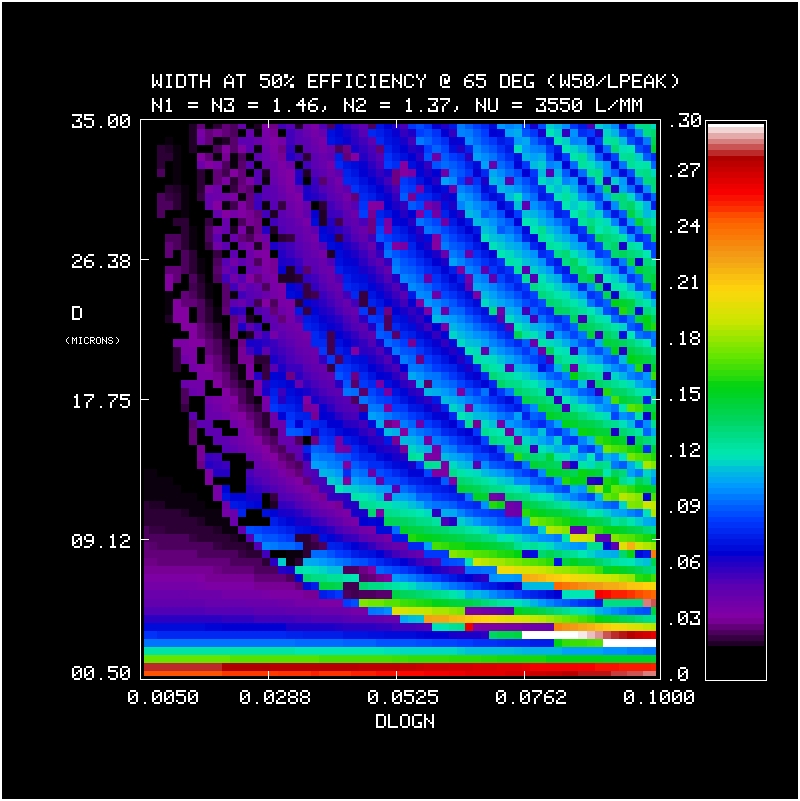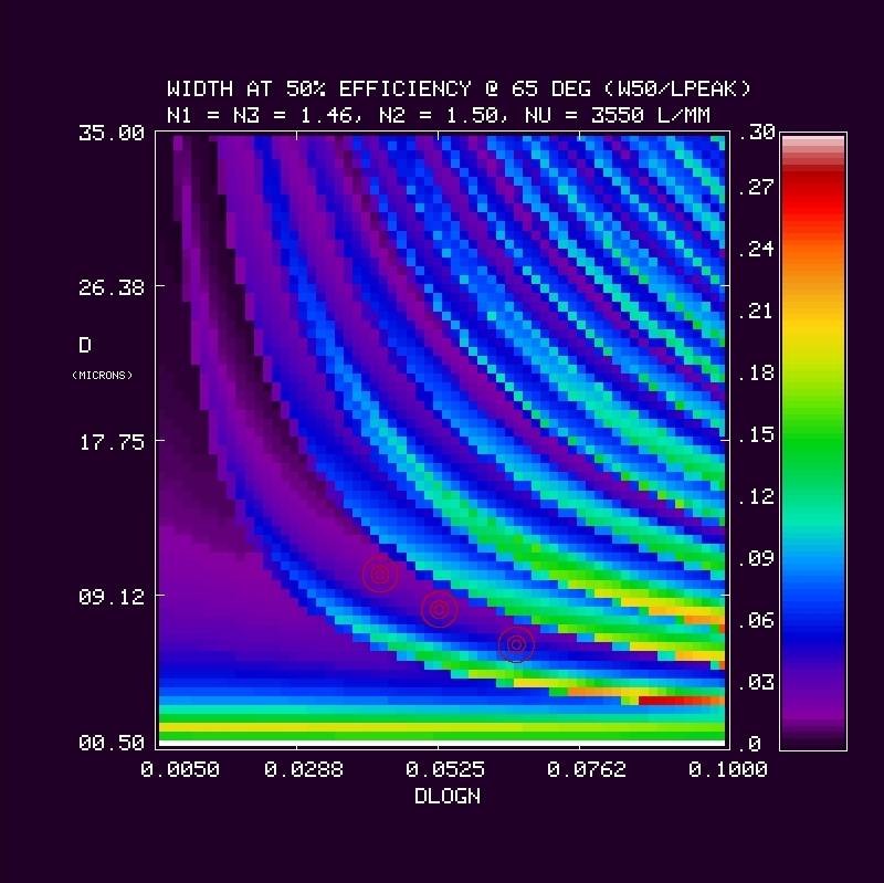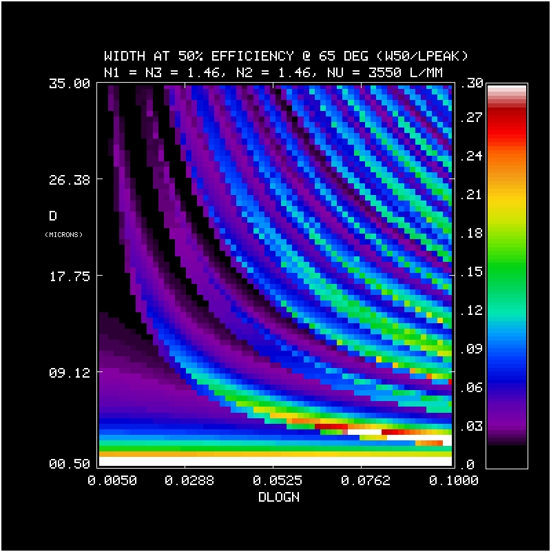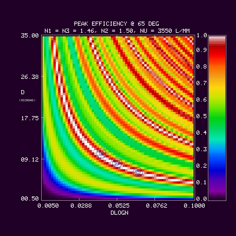 We calculate the efficiency within a bandpass between 380-680 nm at 1 nm resolution for a 3550 l/mm grating at an incidence angle of 65 deg in first order. The calculation is repeated over a grid in mean index (5 values of n2 = 1.37, 1.40, 1.43, 1.46, 1.50), DCG index modulation (64 values dlogn from 0.005 to 0.1), and DCG thickness (70 values of D from 0.5 to 35 microns). The last n2 value (1.50) was done later, and is the adopted CSL target value. At each grid point we have evaluated the the bandpass in terms of: