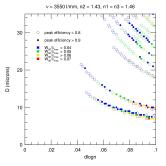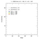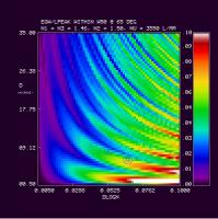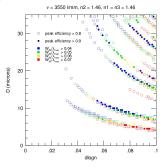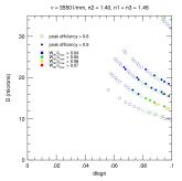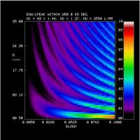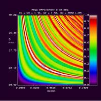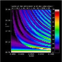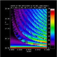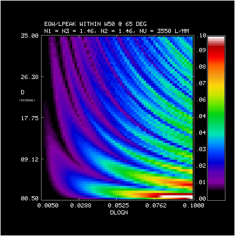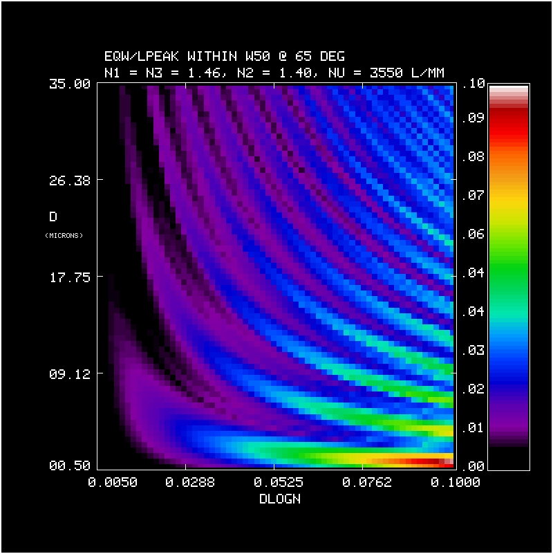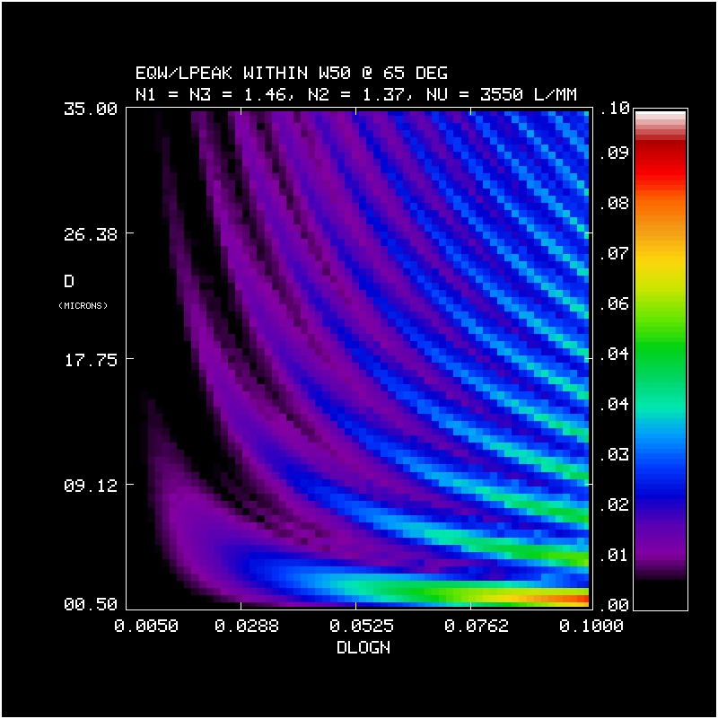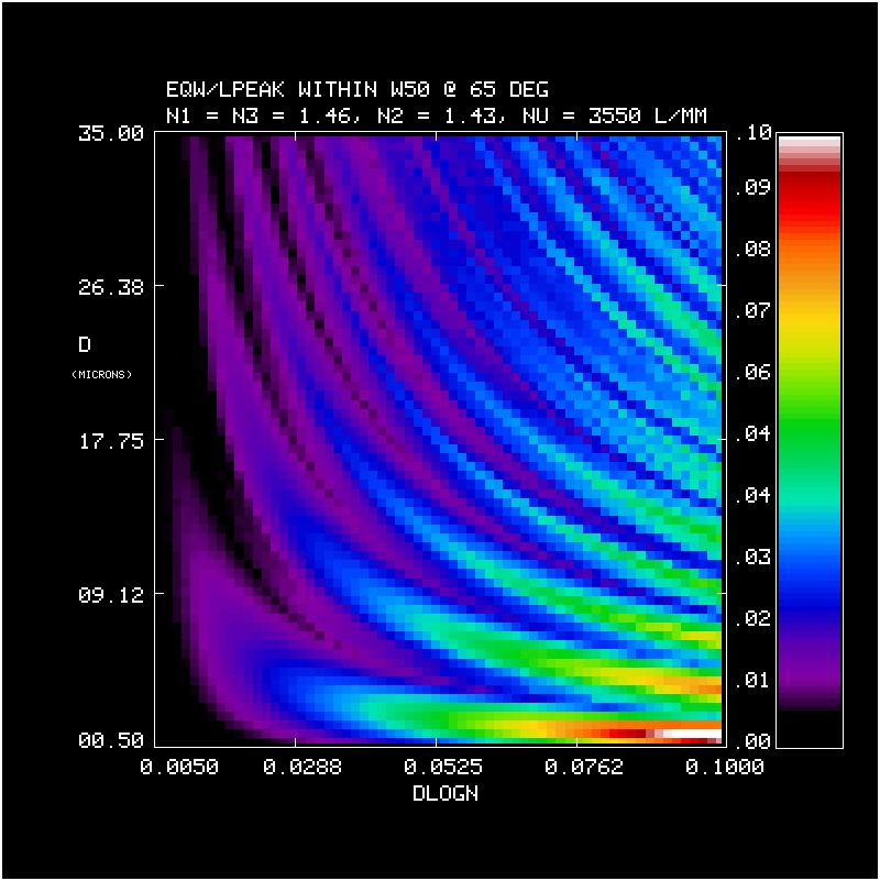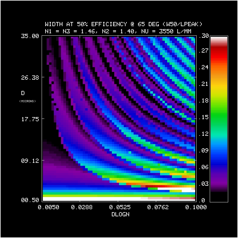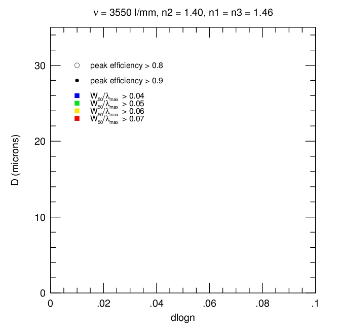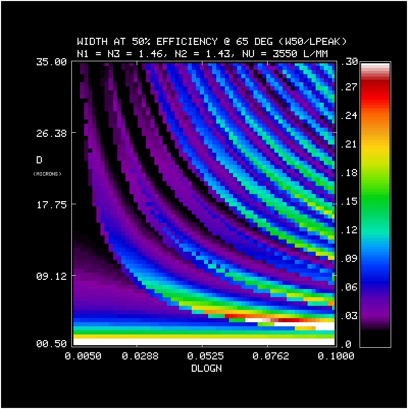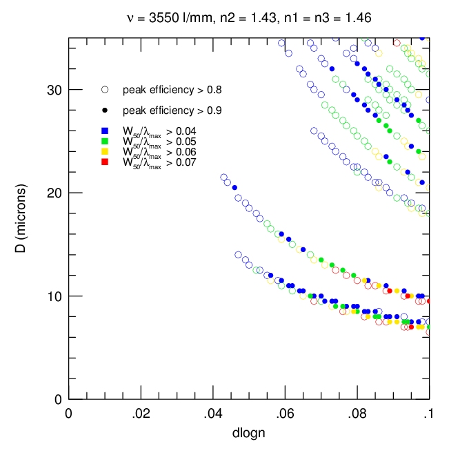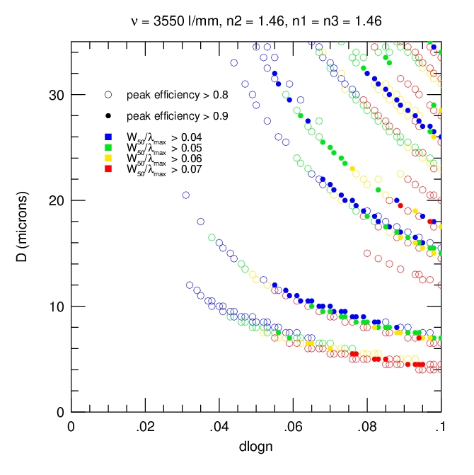 2. Efficiency and Bandwidth: For four different mean DCG refractive indices (n2 = 1.37, 1.40, 1.43, 1.46) we have identified the minimum DCG index modulations and the matching thickness satisfying various peak efficiency and W50 performance criteria. These are tabulated and plotted below. Note WP3200 grating has mean DCG index of 1.4 and a maximum dn of 0.048, or dlogn = 0.034. CSL has indicated it may be able to achieve dn values of 0.076. This translates into dlogn = 0.55 - 0.52 for n2 = 1.37-1.4, respectively, assuming that dn = 0.076 is achievable for this range of n2.